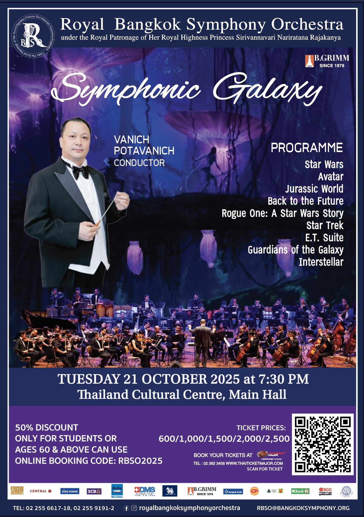 Experience an unforgettable journey across time, space, and imagination with Symphonic Galaxy, an orchestral celebration of the greatest soundtracks from science fiction cinema. Under the baton of RBSO resident conductor Vanich Potavanich, the evening will be an exploration of iconic music that has defined generations of moviegoers.
